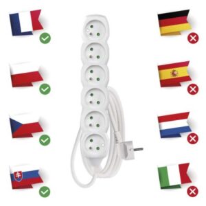 ďalšie funkcie: nie|detské clonky: áno|dĺžka: 2 m|farba: biela|jazyky aplikácie: –|kompatibilita: –|krytie: IP20|materiál zásuvky a vidlice: plast|max. záťaž: 3 680 W|napätie: 250 V~|notifikácie do mobilnej aplikácie: nie|ovládanie hlasovými asistentmi: nie|počet zásuviek: 6|podporované OS: –|predajný obal: 1 ks, záves|prenosová frekvencia: –|prierez vodiča: 1,0 mm²|protokol: –|prúd: 16 A max.|typ izolácie: PVC|USB výstup: nie|vodič: H05VV-F3G|vypínač: nie