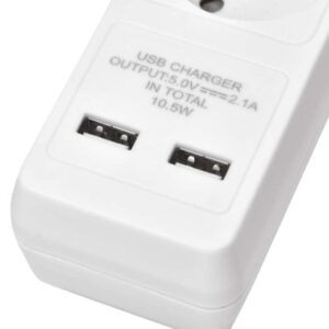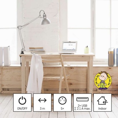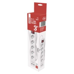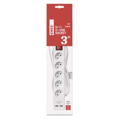 detské clonky: áno|dĺžka: 3 m|farba: biela|krytie: IP20|materiál zásuvky a vidlice: plast|max. záťaž: 3 680 W|napätie: 250 V~|počet zásuviek: 5|predajný obal: 1 ks, záves|prierez vodiča: 1,5 mm²|prúd: 16 A max.|typ izolácie: PVC|USB výstup: 2× USB Σ 2,1 A max. (10,5 W)|vodič: H05VV-F3G|vypínač: áno