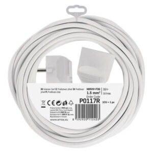 detské clonky: áno|dĺžka: 7 m|farba: biela|krytie: IP20|materiál zásuvky a vidlice: plast|max. záťaž: 3 680 W|napätie: 250 V~|počet zásuviek: 1|predajný obal: 1 ks, záves|prierez vodiča: 1,5 mm²|prúd: 16 A max.|typ izolácie: PVC|USB výstup: nie|vodič: H05VV-F3G|vypínač: nie