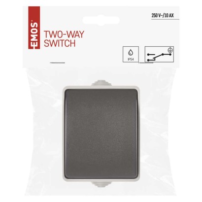 design: neuvádza sa|farba: šedo-čierna|krytie: IP54|predajný obal: 1 ks, PE sáčok|prevedenie: 1 tlač. schodiskový vodeodolný|produkt: spínač striedavý – č. 6|spôsob montáže: na stenu|typ: 250 V~/10 AX