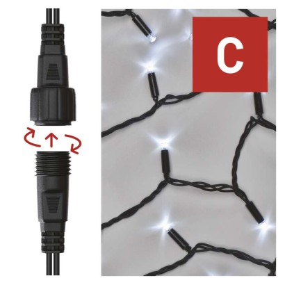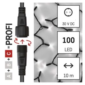 časovač: neuvádza sa|diaľkový ovládač: nie|dĺžka prívodu: 10 cm|farba drôtu: čierna|farba svetla: studená biela|funkcia: svieti/bliká|krytie: IP44|LED medzera: 10 cm|materiál: guma|možnosť prepojenia: áno|počet LED: 100|použitie: vonkajšie aj vnútorné|predajný obal: 1 ks, krabica|pre výšku stromu: neuvádza sa|príkon: max. 6 W|produkt: reťaz|rozmer: 10 m|tvar: klasický|typ napájania: sieťový adaptér (nie je súčasťou balenia)|veľkosť LED: 7 mm|vstupné napätie: 30 V DC|výstupné napätie: neuvádza sa|záručná doba: 3 roky|životnosť: 10 000 hodín