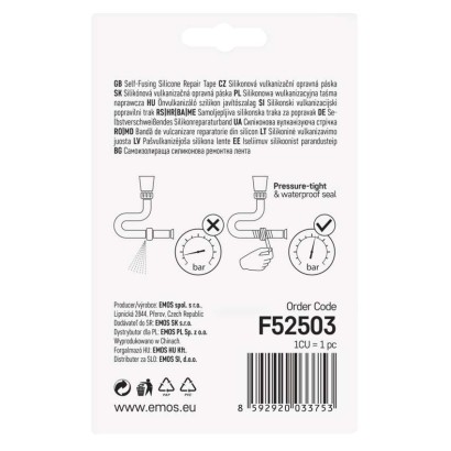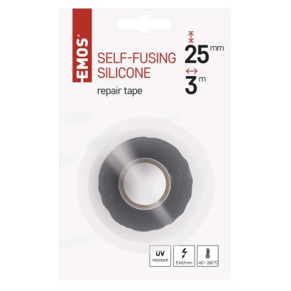 dĺžka návinu: 3 m|elektrická pevnosť minimálne: 8 kV/mm|elektrická pevnosť po vlhku minimálne: neuvádza sa|farba: čierna|hrúbka pásky: 0,60 mm|integrovaná textilná sieťka: neuvádza sa|materiál lepidla: bez lepidla|odolné UV: áno|odporúčaná skladovacia teplota: neuvádza sa|pevnosť v ťahu: neuvádza sa|potlač: bez potlače|predajný obal: 1 ks, blister|predĺženie minimálne: až 400 %|predpokladané použitie: hobby, dielňa, záhrada, opravy v motorovom priestore vozidla, núdzové opravy potrubia, hadíc|priľnavosť k oceli minimálne: neuvádza sa|priľnavosť k podkladu: neuvádza sa|rozmer: 60 × 30 mm|rozsah inštalačných teplôt: -60–260 °C|samozhášavé: neuvádza sa|šírka pásky: 25 mm|skúška plameňom: <1 sec|spĺňa smernicu REACH: neuvádza sa|spĺňa smernicu ROHS: neuvádza sa|typ pásky: silikónová vulkanizačná|vodotesný spoj: áno|vyhovuje norme: neuvádza sa|vytvára tlakotesný spoj: áno