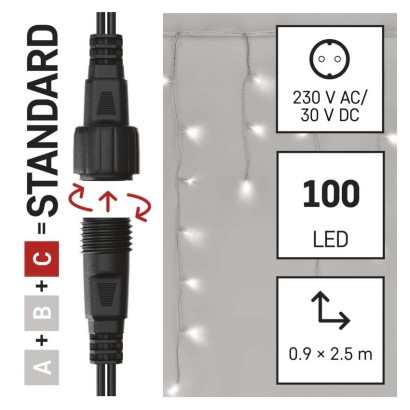 časovač: neuvádza sa|diaľkový ovládač: nie|dĺžka prívodu: 10 cm|farba drôtu: transparentná|farba svetla: studená biela|funkcia: svieti/bliká|krytie: IP44|LED medzera: 10 cm|materiál: PVC|možnosť prepojenia: áno|počet LED: 100|použitie: vonkajšie aj vnútorné|predajný obal: 1 ks, krabica|pre výšku stromu: neuvádza sa|príkon: max. 5 W|produkt: kvaple|rozmer: 2,5 × 0,9 m|tvar: klasický|typ napájania: sieťový adaptér (nie je súčasťou balenia)|veľkosť LED: 5 mm|vstupné napätie: 30 V DC|výstupné napätie: neuvádza sa|záručná doba: 2 roky|životnosť: 10 000 hodín