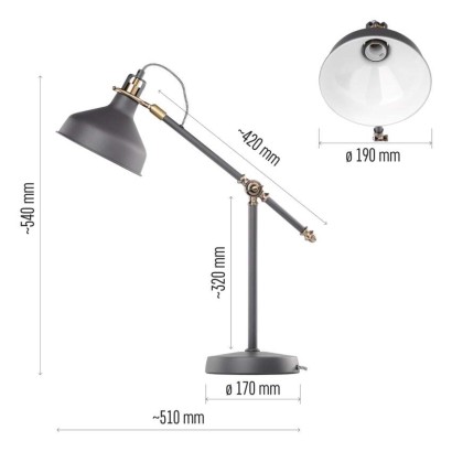 činiteľ starnutia: neuvádza sa|čip LED: neuvádza sa|dĺžka prívodného kábla: 1,5 m|energetická trieda: neuvádza sa|energetická trieda (od 1.9.2021): neuvádza sa|farba: tmavo šedá|farba svetla: neuvádza sa|index podania farieb (CRI): neuvádza sa|integrovaná nabíjacia batéria: nie|krytie: IP20|materiál: kov|max. výkon: 25 W|napájacie trafo: 220–240 V|napájací zdroj súčasťou balenia: nie|napätie: 220–240 V|obsah ortuti: neuvádza sa|pätica (uchytenie žiarovky): E27|počet LED: neuvádza sa|počet spínacích cyklov: neuvádza sa|predajný obal: 1 ks, krabica|príkon: neuvádza sa|rozmer: 565 × 185 × 560 mm|rýchlosť nábehu na 100 %: neuvádza sa|stmievanie: nie|svetelný tok: neuvádza sa|teplota chromatičnosti: neuvádza sa|typ napájania: sieť|účinník: neuvádza sa|USB port: nie|životnosť: neuvádza sa