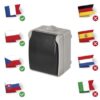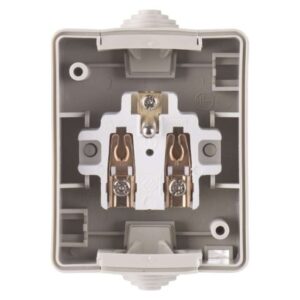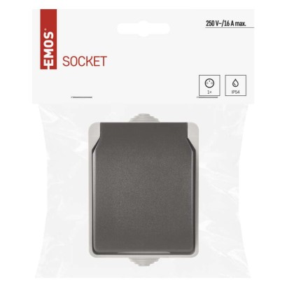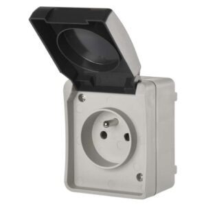 design: FRENCH|farba: šedo-čierna|krytie: IP54|predajný obal: 1 ks, PE sáčok|prevedenie: 1 nás. vodeodolná|produkt: zásuvka jednonásobná s ochranným kolíkom a viečkom|spôsob montáže: na stenu|typ: 250 V~/16 A max.