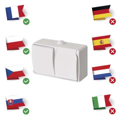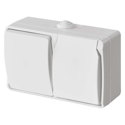 design: FRENCH|farba: biela (matná)|krytie: IP44|predajný obal: 1 ks, PE sáčok|prevedenie: 2 nás. vodeodolné – 1 × zásuvka + 1 × prepínač striedavý|produkt: kombinácia prepínača striedavého č. 6 a zásuvky jednonásobnéj s ochranným kolíkom a viečkom|spôsob montáže: na stenu|typ: zásuvka 250 V ~ / 16 A max .; prepínač 250V ~, 10AX