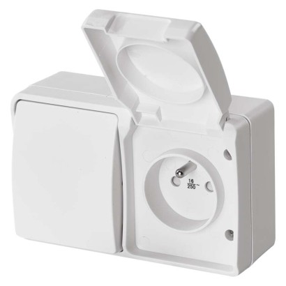 design: FRENCH|farba: biela (matná)|krytie: IP44|predajný obal: 1 ks, PE sáčok|prevedenie: 2 nás. vodeodolné - 1 × zásuvka + 1 × prepínač striedavý|produkt: kombinácia prepínača striedavého č. 6 a zásuvky jednonásobnéj s ochranným kolíkom a viečkom|spôsob montáže: na stenu|typ: zásuvka 250 V ~ / 16 A max .; prepínač 250V ~, 10AX